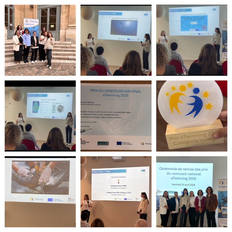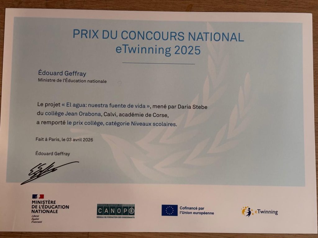 Le projet El agua, nuestra fuente de vida (l’eau, notre source de vie) est lauréat du concours national eTwinning catégorie Collège, niveau scolaire. La remise du prix a eu lieu le vendredi 3 avril 2026.