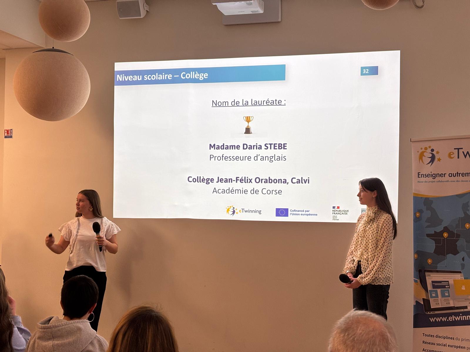 Deux élèves, Lesia M. et Clara R de 3eme C, ont accompagné leur professeur à Paris afin de présenter le projet devant un public expérimenté. Elles ont réalisé une présentation exceptionnelle en cinq langues différentes : français, espagnol, anglais, italien et langue corse.